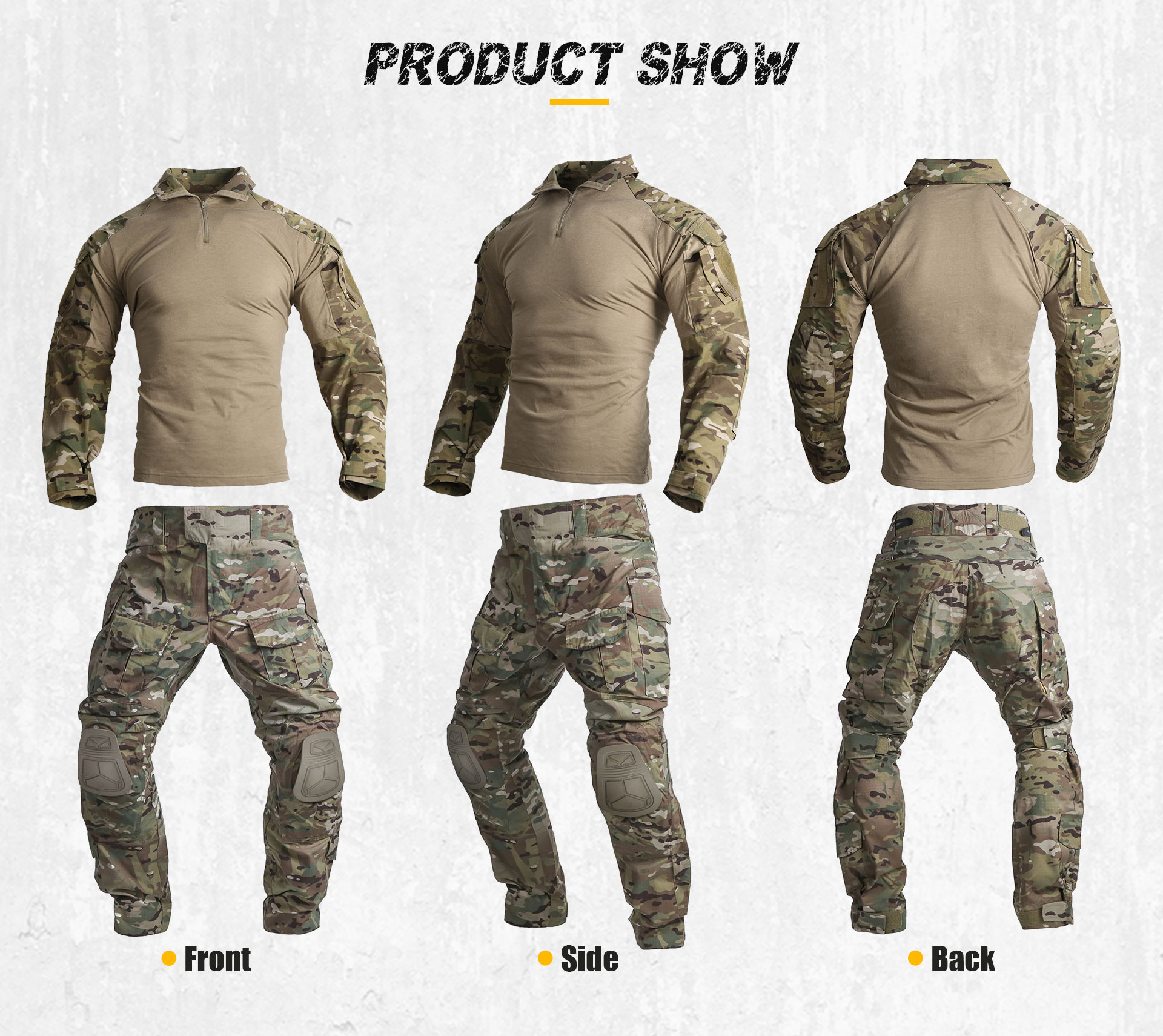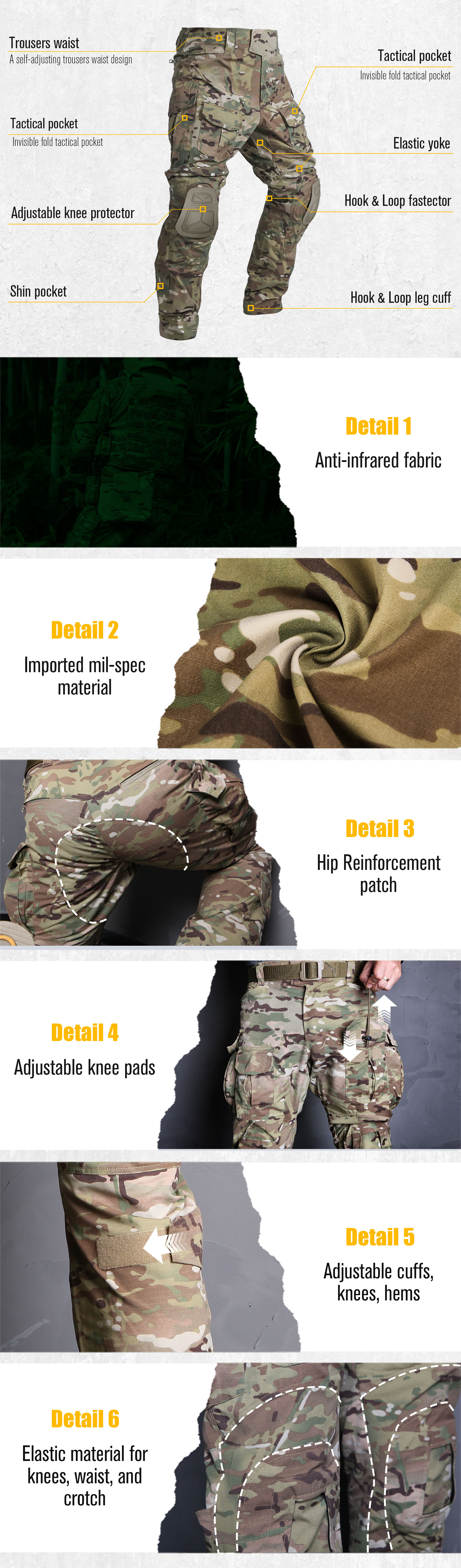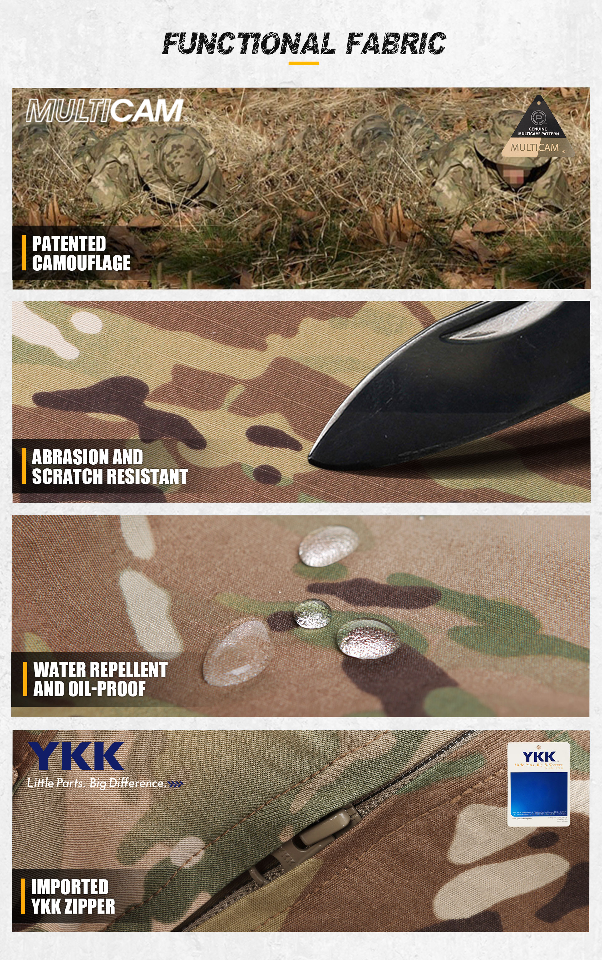 Tops: The splicing design of this product is one of its highlights. The G3 combat T-box uses wear-resistant material pearl sail lattice (nc50/50 imported pearl sail lattice original multicam) for the positions where friction often occurs in the design ® NYCO 6.6oz ripstop (nylon) is made of Kanglun antibacterial fiber. Permanent antibacterial fabric can effectively resist the growth of bacteria, sweat odor and sweat trace, and is comfortable and close to the body; The service style design is adopted at the cuffs, which can effectively improve the wearing feeling, so that it can maintain good sports performance without losing the shape of a slim fit.